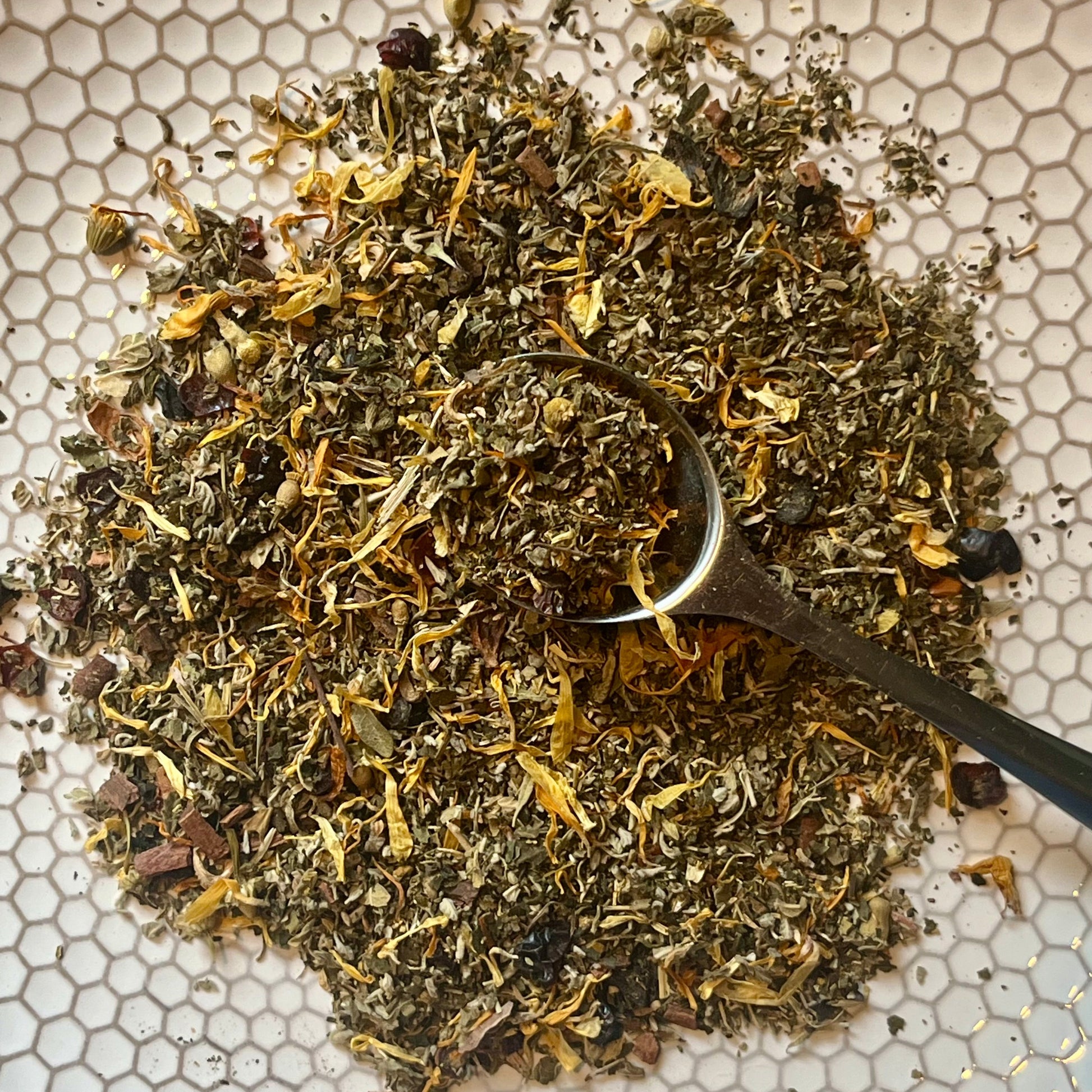 All Organic Ingredients: nettle, damiana, calendula, chamomile, rose hip and cinnamon chips